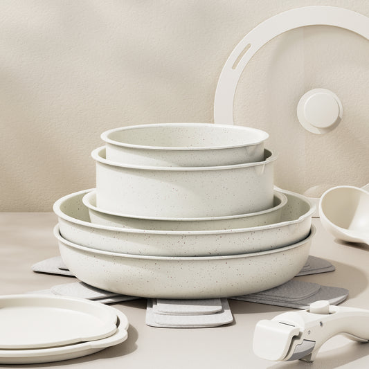 Bazova Ceramic Nonstick 17-Piece Cookware Set with Removable Handles - Cream White