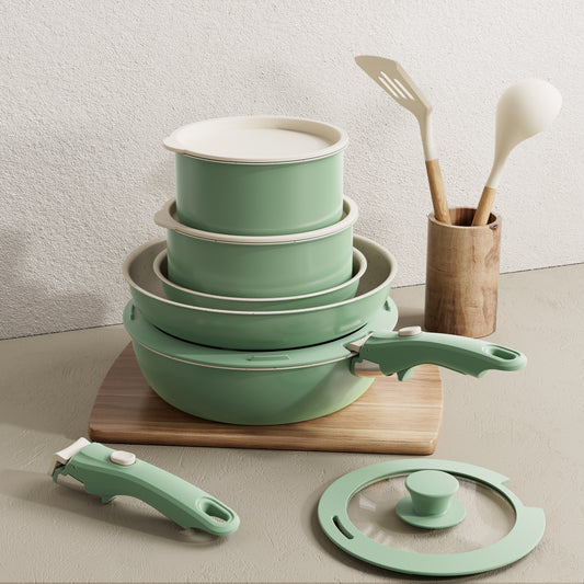 Bazova Ceramic Nonstick 17-Piece Cookware Set with Removable Handles - Green