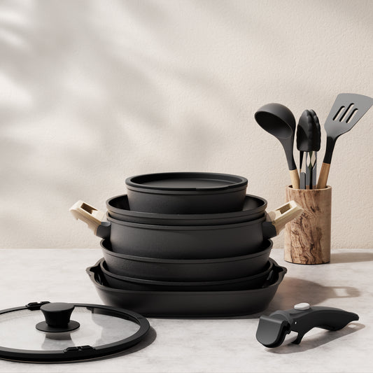Bazova Ceramic Nonstick 19-Piece Cookware Set with Removable Handles - Black