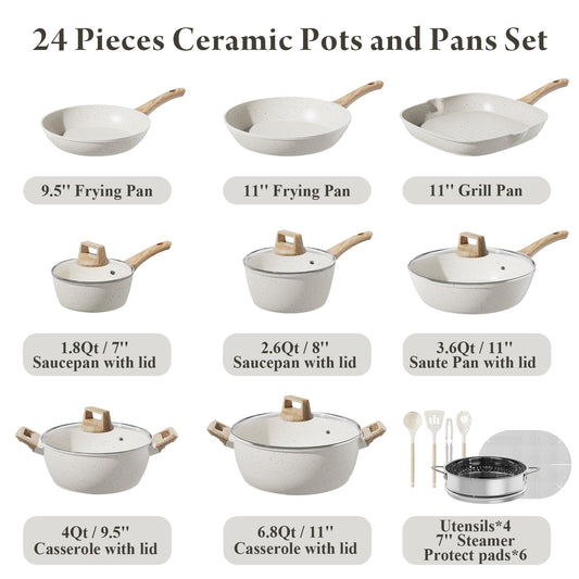 Bazova Ceramic Nonstick 24-Piece Cookware Set – Cream White